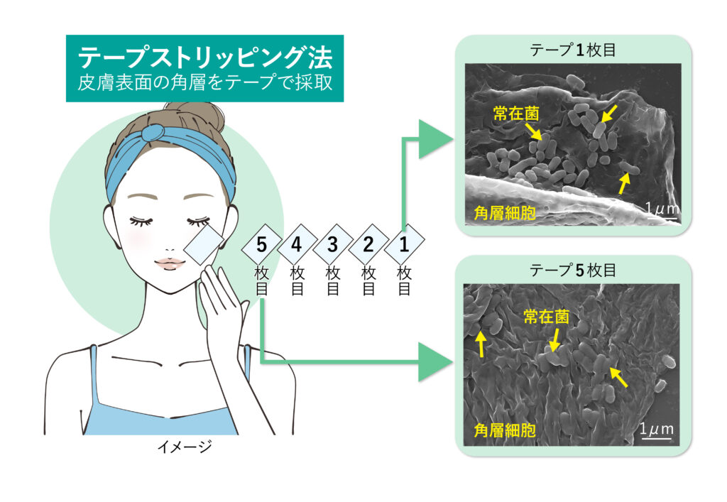 ニキビ患者の方の肌上にはニキビの原因菌であるアクネ菌がとどまり続けており、それらは日々の洗顔では除去しきれないと考えられています。ニキビ予防のための洗顔料には殺菌成分などが含まれているにもかかわらず、洗顔しても肌にアクネ菌が残存し続けるのはなぜなのか、その原因は肌内部にあるのではないかと考え、はじめに、角層中の皮膚常在菌に着目した検討を行いました。