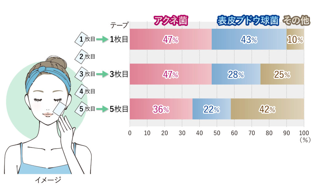 さらに、ニキビができやすい女性の角層を採取したテープから皮膚常在菌を抽出し、菌叢解析を行いました。その結果を図5に示します。テープ1枚目、3枚目、5枚目のいずれからも多数の菌種が検出され、特にアクネ菌が多く検出されていました。