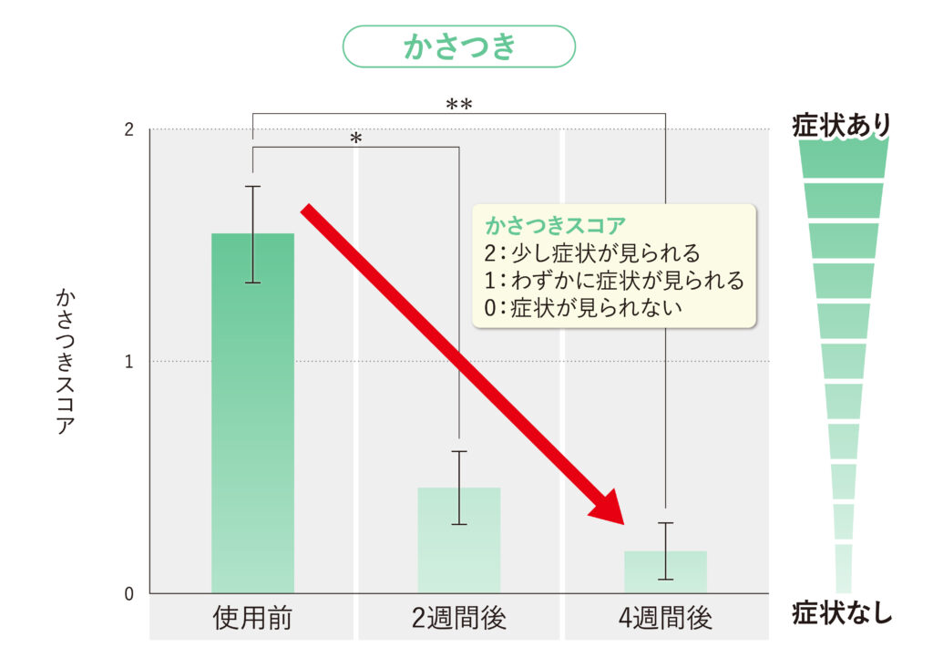 殺菌成分・抗炎症成分を配合したふきとり化粧水を含ませたコットンによるふきとりケアを4週間継続することで、角層水分量、水分蒸散量※3、赤みスコア、かさつきスコアなど、肌状態に関する指標が有意に改善していました(図11)。
