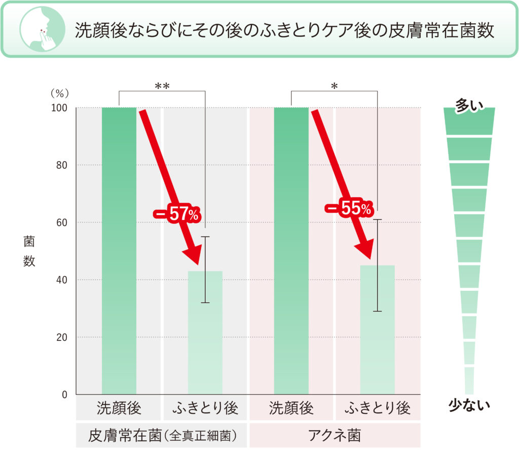 - 洗顔のみの場合と比べて、ふきとり化粧水を使用することで、アクネ菌の量を約50%減少させることを示しました。