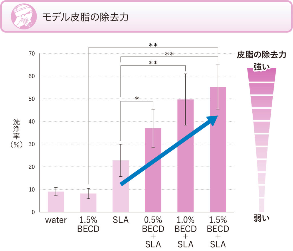 また、モデル皮脂を塗布した腕に液体皮膚洗浄料を滴下し、水流による洗浄力を評価したところ、両親媒性エステル (BECD)自身にはモデル皮脂を洗浄する作用は認められなかったものの、低濃度のアミノ酸系界面活性剤 (SLA)と併用した場合では、両親媒性エステル (BECD)の濃度に比例して、皮脂の除去力を高めるということがわかりました(図3)。
