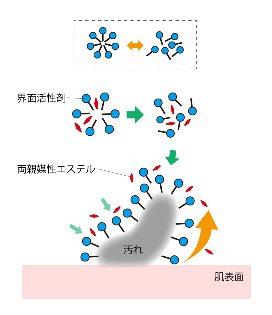 前述した通り、両親媒性エステルと界面活性剤を併用することによって、単一の界面活性剤分子が古い角質をつなぎとめているお肌の中の接着タンパク質に作用しやすくなり、角質のピーリング作用を高めたと考えられます。