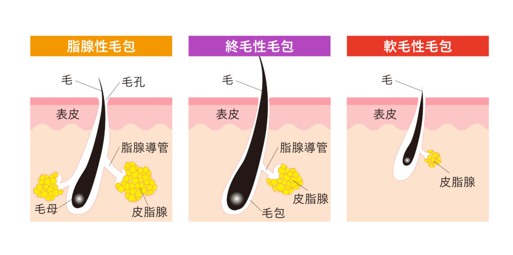 - 脂腺性毛包: ほとんど毛が目立たない代わりに、皮脂腺が大きく発達した毛穴。