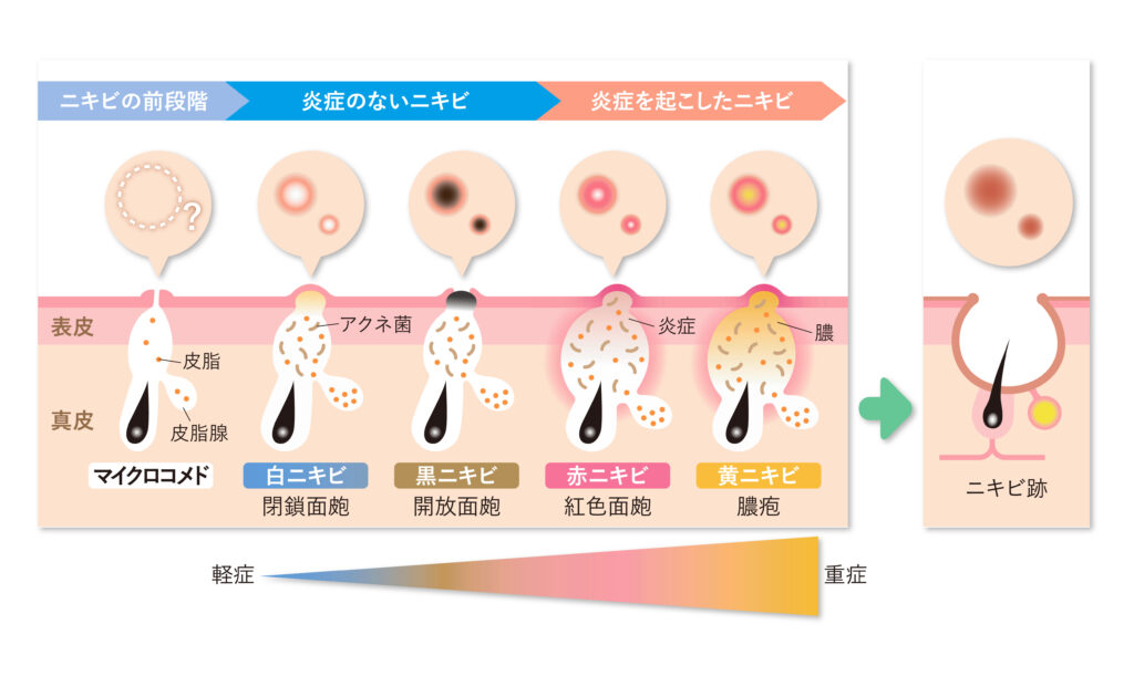 ニキビのすべての始まりは、「マイクロコメド(微小面皰)」と呼ばれる目に見えないほどの小さな毛穴のふくらみです。手で触るとザラツキを感じることがあるかもしれません。